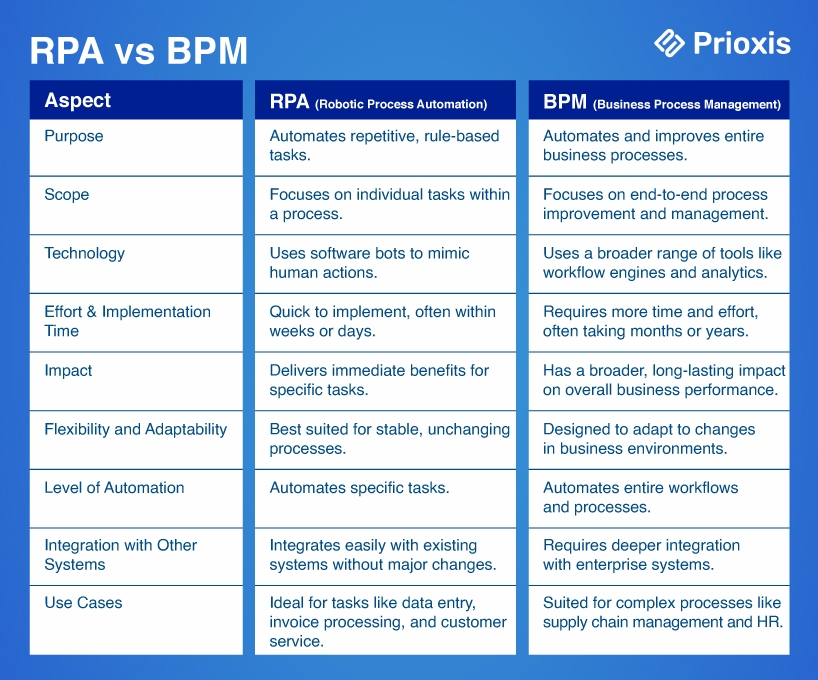 RPA and BPM serve different purposes. However, they are not mutually exclusive. In fact, they work best when used together. RPA can be a part of a BPM strategy, automating specific tasks within a broader, optimized process. This combination allows businesses to achieve greater efficiency and effectiveness.
