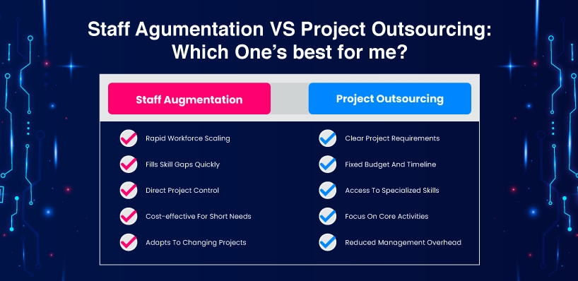 Deciding between staff augmentation and project outsourcing is crucial for addressing business resource needs. Each model has distinct advantages suitable for different scenarios. Here’s a guide to help you choose: