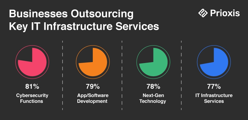 In fact, 81% of businesses outsource cybersecurity functions, with app/software development (79%), next-gen technology (78%), and IT infrastructure services (77%) closely following. These stats show the growing trend of companies choosing to outsource their IT needs to stay competitive and focus on their core business.