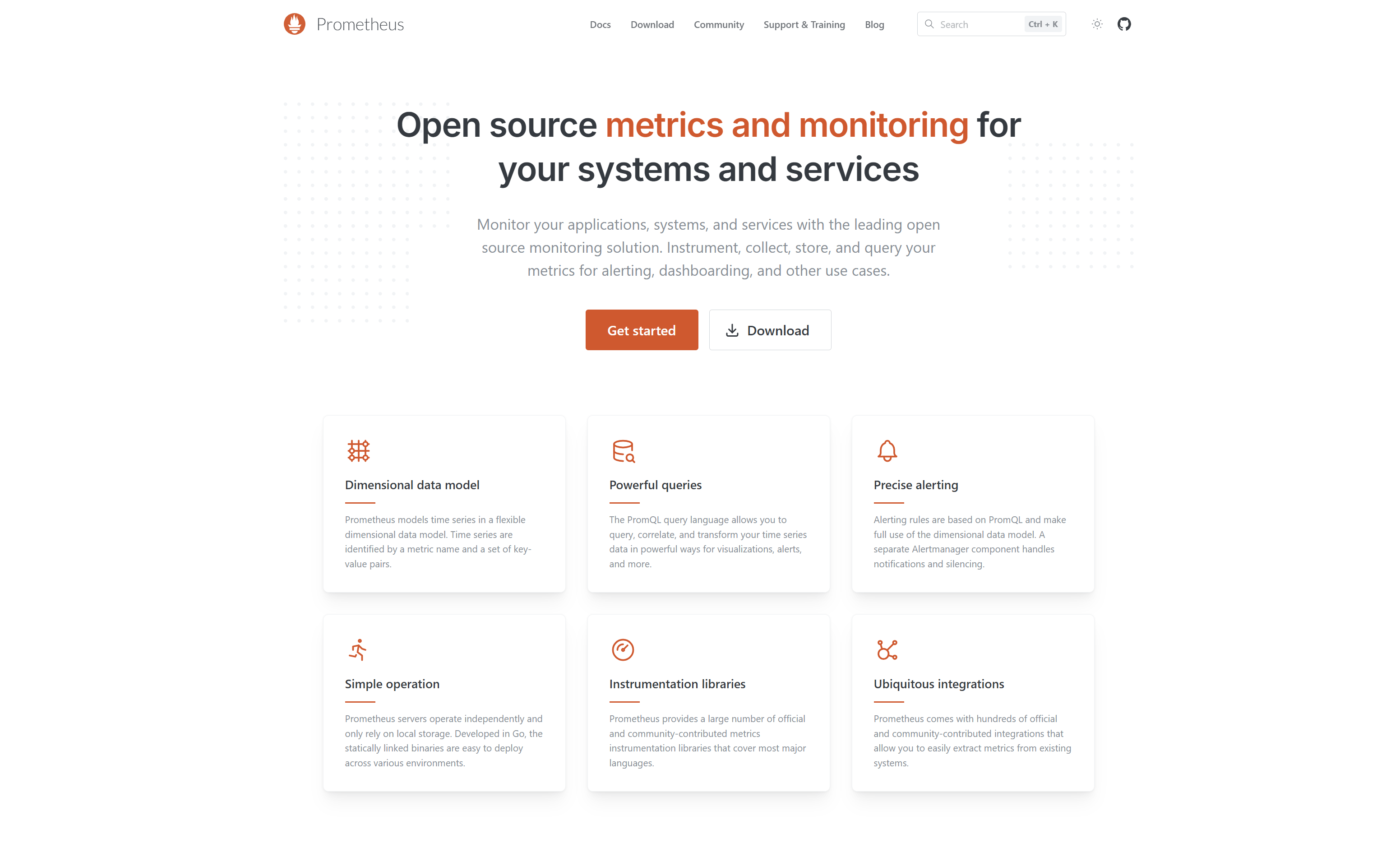 Prometheus is an open-source monitoring toolkit. Choose Prometheus to access a thriving and expansive development community. Prometheus has several parts that work together to monitor your systems. These include an alert manager and the main Prometheus server.