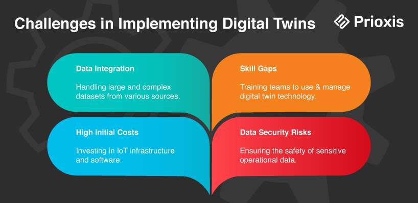While digital twins provide immense value, businesses must overcome certain challenges for successful implementation: