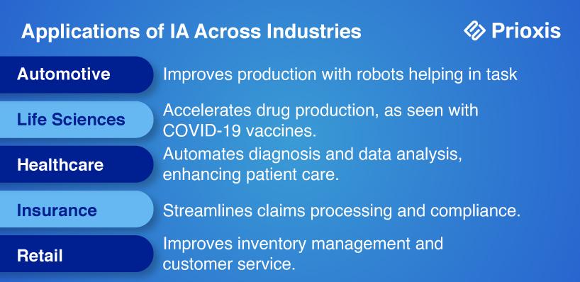 For instance, a car manufacturer might use IA to speed up production lines and cut errors. A pharmaceutical company can use IA to reduce costs and increase efficiency in drug development. Whereas an insurance company can use IA to automate tasks like calculating rates, processing claims, and ensuring compliance with regulations.