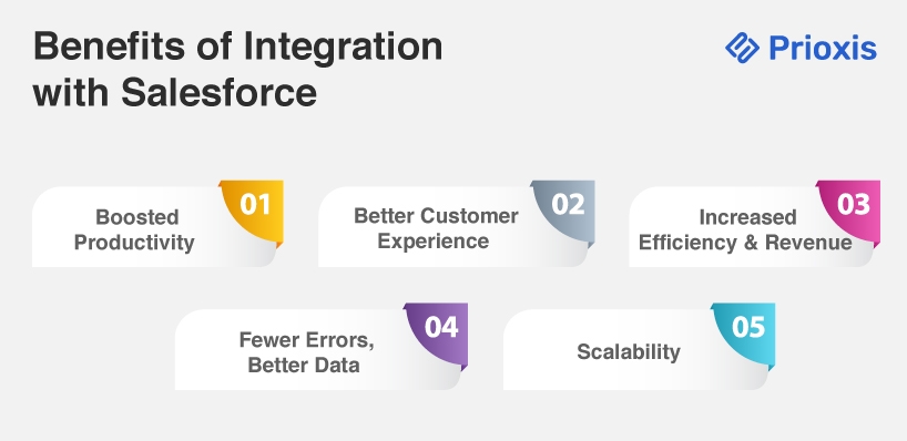Integration with Salesforce leads to more efficient workflows and can boost revenue. For example, companies using Salesforce Marketing Cloud reported a 60% increase in site conversion rates and a 35% boost in average order values by the third year of integration.