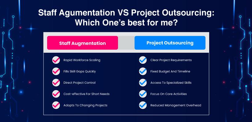 - Staff Augmentation Offers greater control over the augmented staff and project outcomes, making it ideal for businesses that need specific expertise for short-term projects.